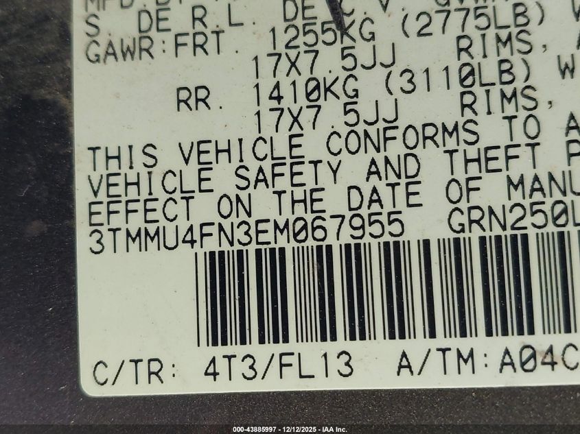 Цвет СерыйЦилиндры 6Привод Полный приводVIN 3TMMU4FN3EM067955Состояние Заводится и едет (проверено)Повреждения Опрокидывание