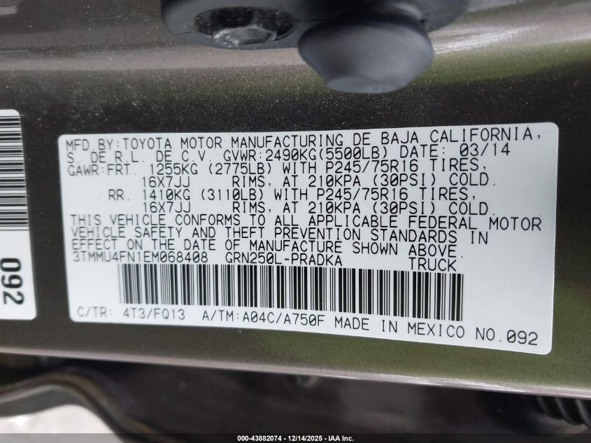 2014 TOYOTA TACOMA - 3TMMU4FN1EM068408, цвет - Бежевый, 4.0, Бензин, Полный привод из США