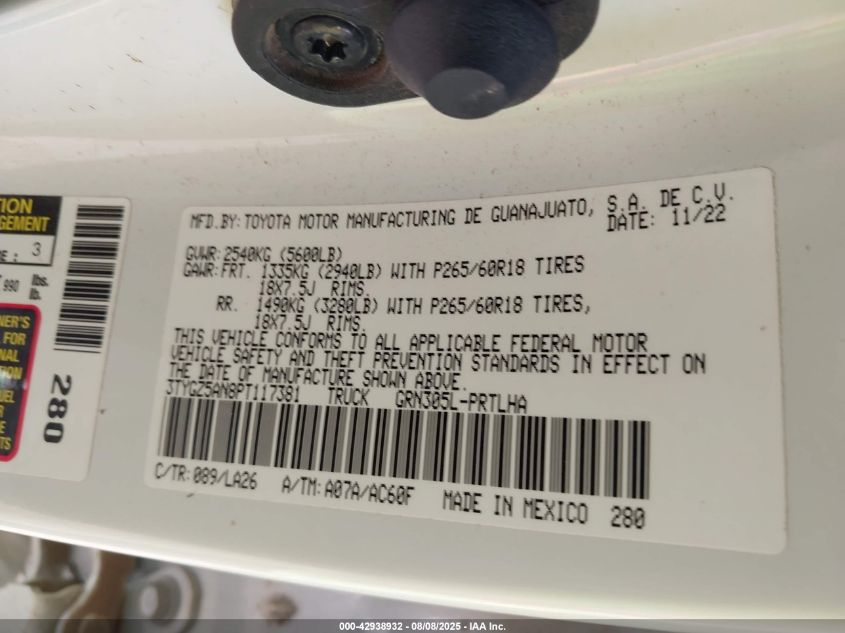 2023 TOYOTA TACOMA - 3TYGZ5AN8PT117381, цвет - Белый, 3.5, Бензин, Полный привод из США