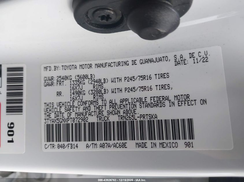 2023 TOYOTA TACOMA - 3TYAX5GNXPT072902, цвет - Белый, 2.7, Бензин, из США
