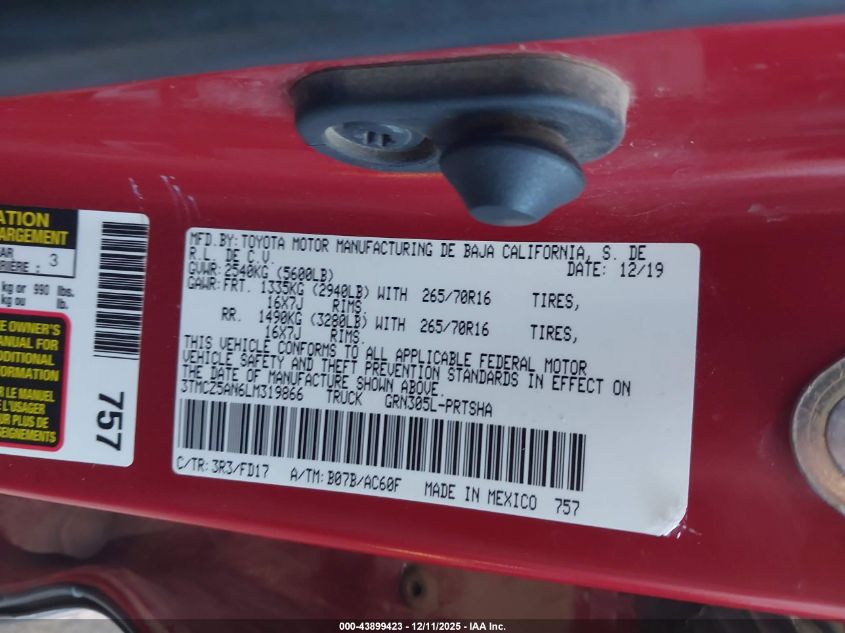 2020 TOYOTA TACOMA - 3TMCZ5AN6LM319866, цвет - Красный, 3.5, Бензин, Полный привод из США