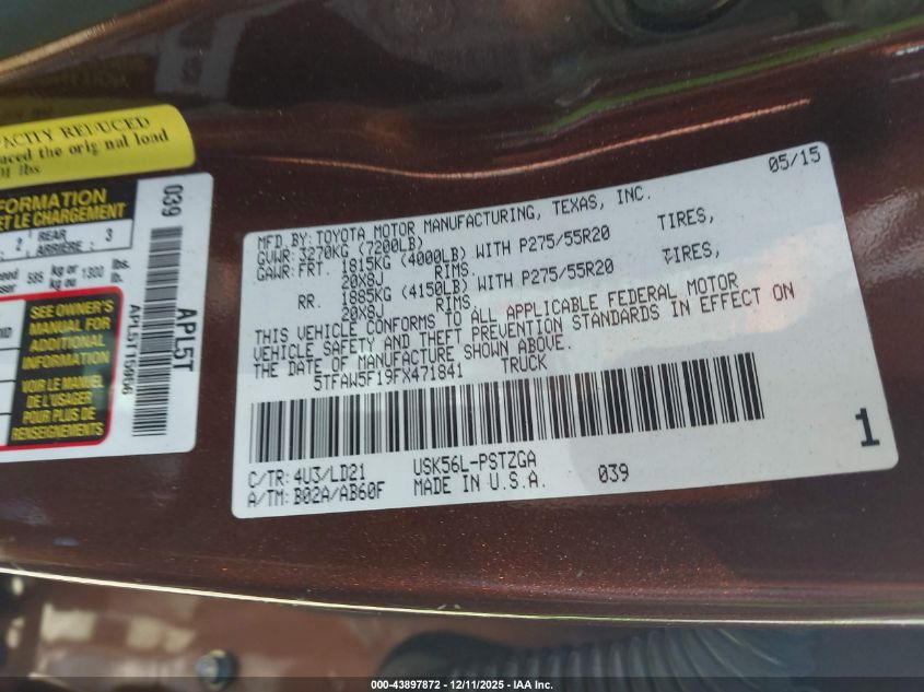 2015 TOYOTA TUNDRA - 5TFAW5F19FX471841, цвет - Апельсиновый, 5.7, Бензин, Полный привод из США