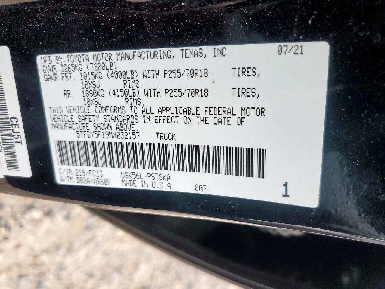 2021 TOYOTA TUNDRA - 5TFDY5F19MX032157, цвет - Черный, 5.7, Бензин, 4x4 с задним приводом из США