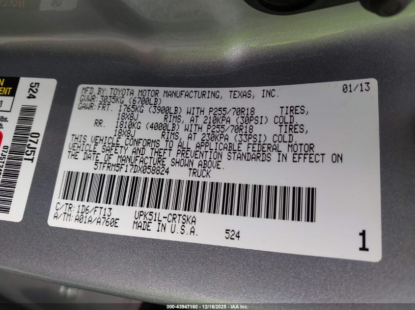 2013 TOYOTA TUNDRA - 5TFRM5F17DX058824, цвет - Серебряный, 4.6, Бензин, из США