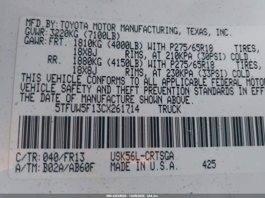 2012 TOYOTA TUNDRA - 5TFUW5F13CX261714, цвет - Белый, 5.7, Бензин, Полный привод из США