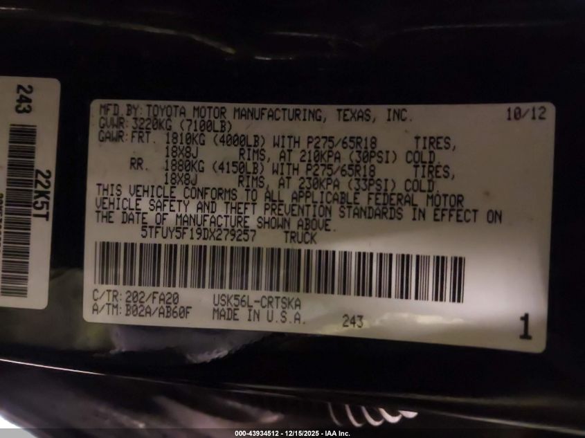 2013 TOYOTA TUNDRA - 5TFUY5F19DX279257, цвет - Черный, 5.7, Бензин, Полный привод из США