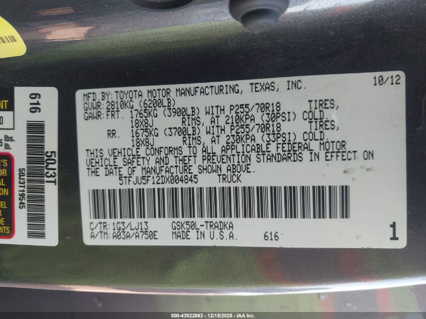 2013 TOYOTA TUNDRA - 5TFJU5F12DX004845, цвет - Серый, 4.0, Бензин, из США