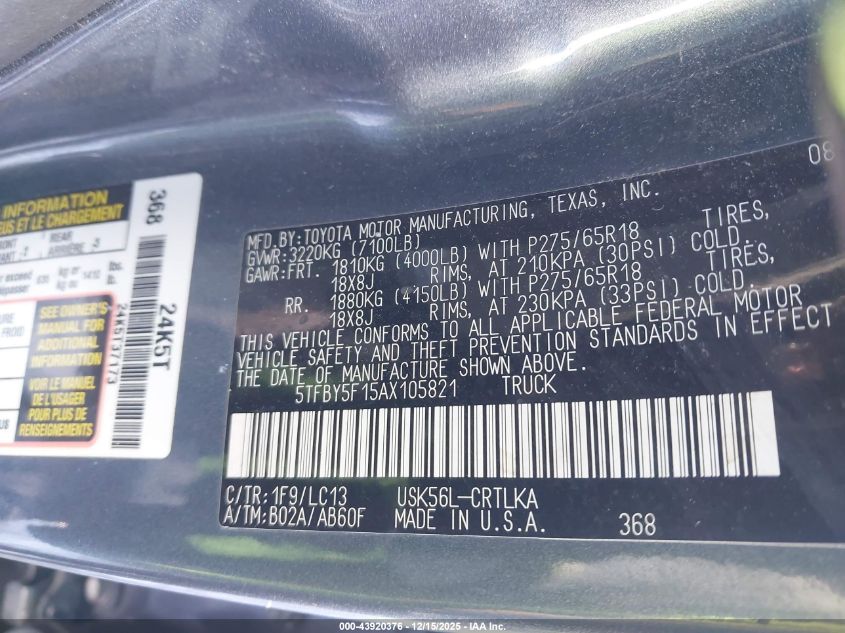 2010 TOYOTA TUNDRA - 5TFBY5F15AX105821, цвет - Серый, 5.7, Бензин, Полный привод из США