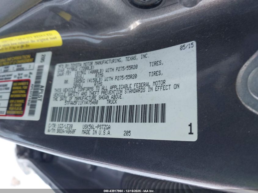 2015 TOYOTA TUNDRA - 5TFAW5F11FX475480, цвет - Бежевый, 5.7, Бензин, Полный привод из США