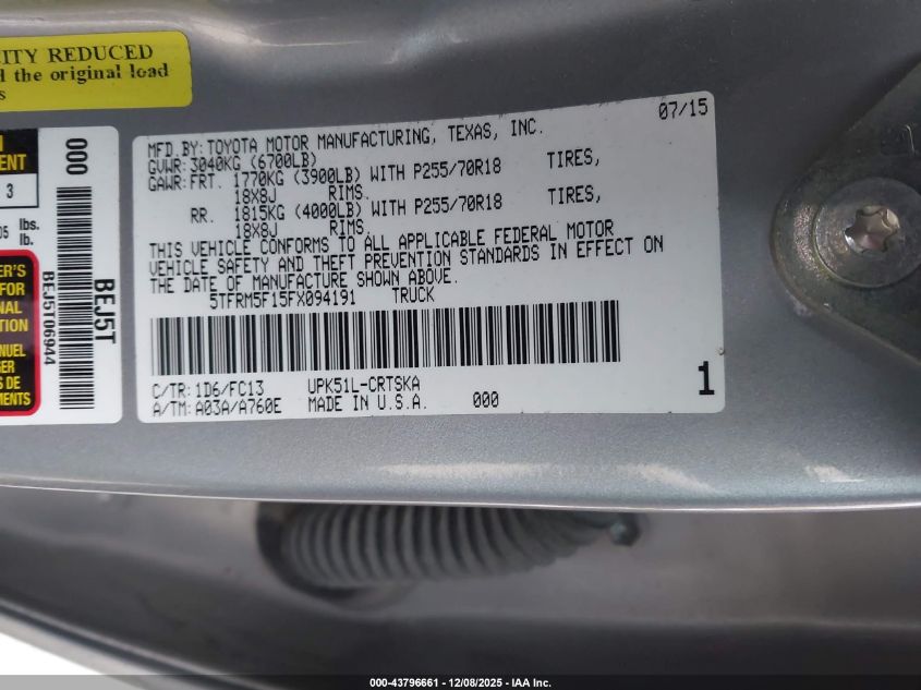 2015 TOYOTA TUNDRA - 5TFRM5F15FX094191, цвет - Серебряный, 4.6, Бензин, из США
