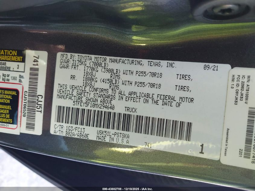 2021 TOYOTA TUNDRA - 5TFEY5F10MX294640, цвет - Серый, 5.7, Бензин, из США
