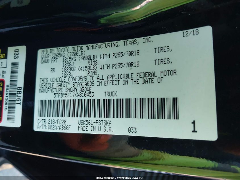 2019 TOYOTA TUNDRA - 5TFDY5F17KX810453, цвет - Черный, 5.7, Бензин, Полный привод из США