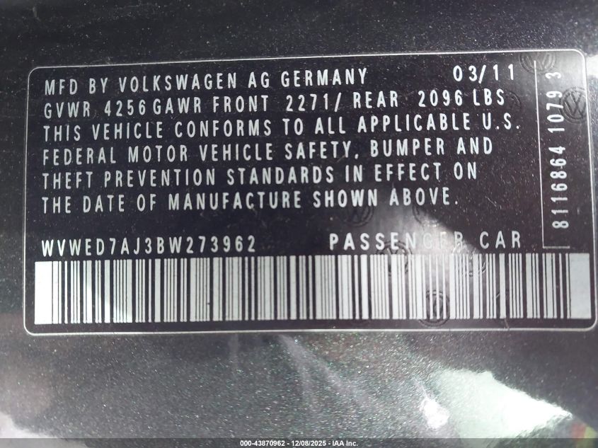 2011 VOLKSWAGEN GOLF GTI - WVWED7AJ3BW273962, цвет - Черный, 2.0, Бензин, Передний привод из США