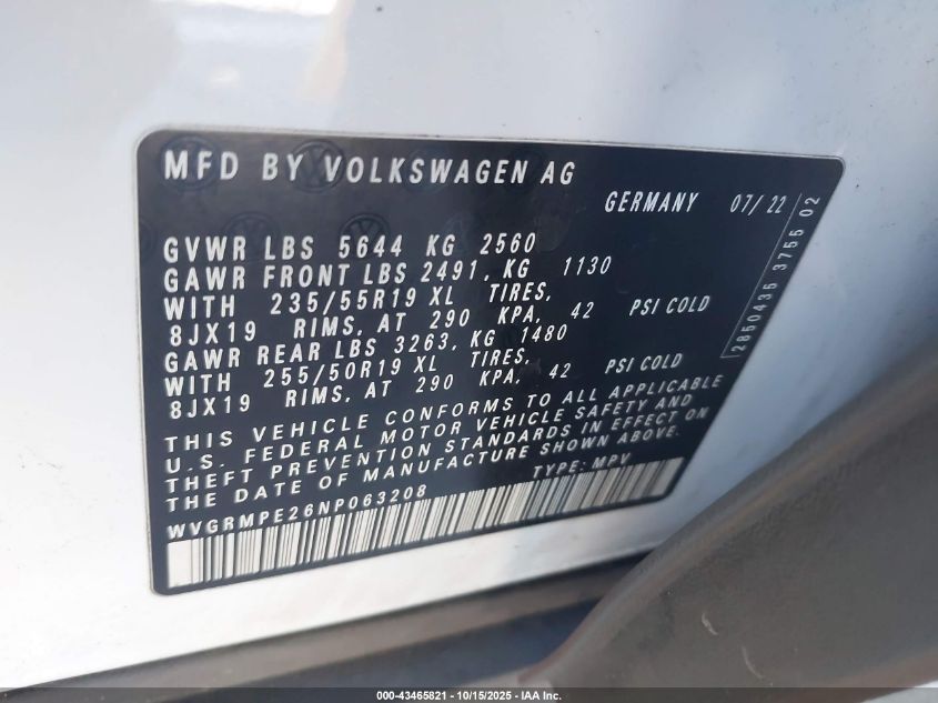 2022 VOLKSWAGEN ID.4 - WVGRMPE26NP063208, цвет - Белый, 0.0, Электрический, из США