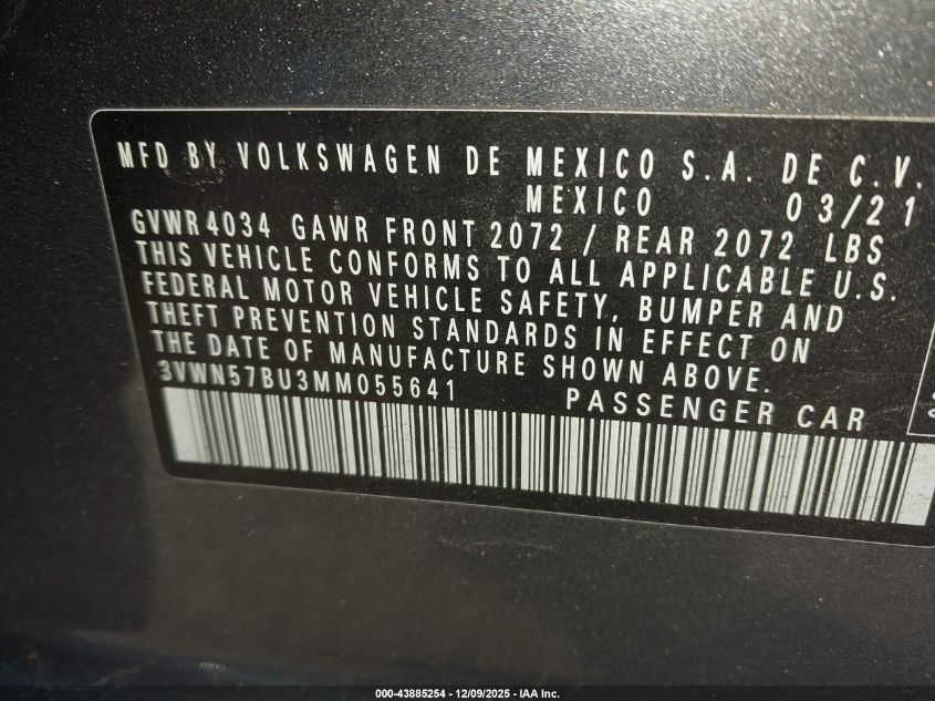2021 VOLKSWAGEN JETTA - 3VWN57BU3MM055641, цвет - Серый, 1.4, Бензин, Передний привод из США