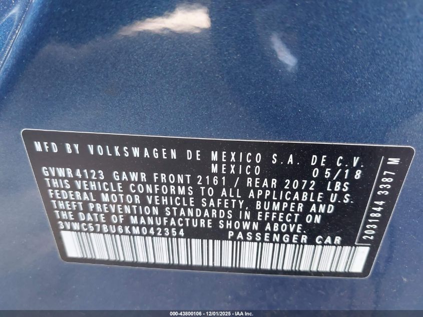 2019 VOLKSWAGEN JETTA - 3VWC57BU6KM042354, цвет - Синий, 1.4, Бензин, Передний привод из США