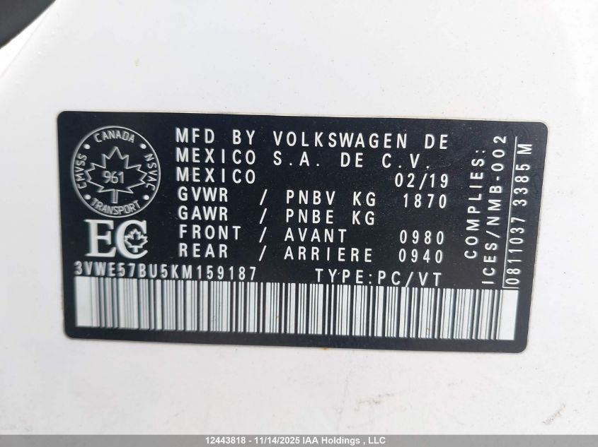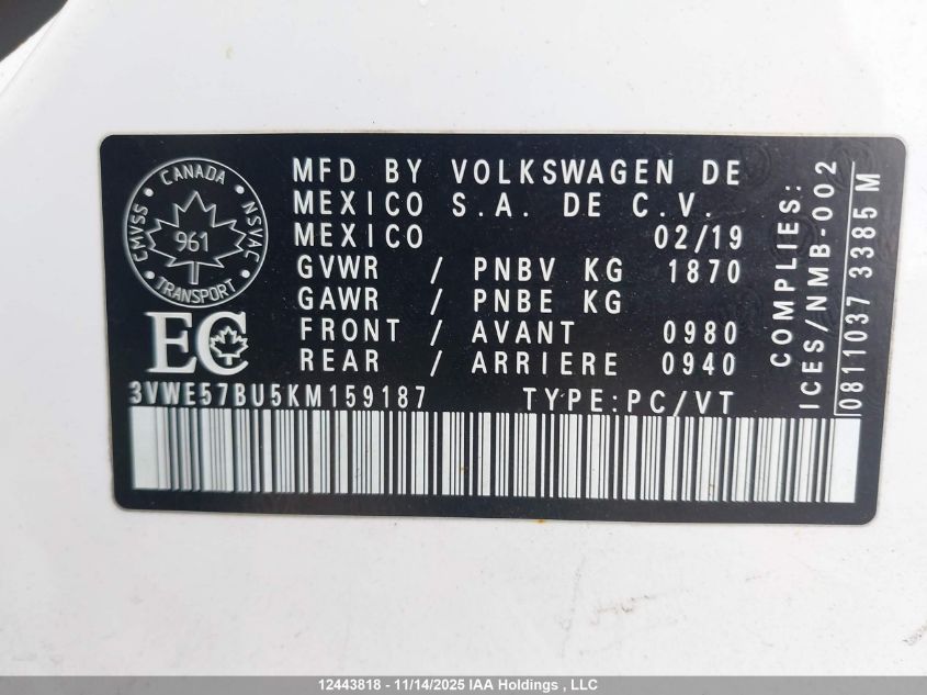 2019 VOLKSWAGEN JETTA - 3VWE57BU5KM159187, цвет - Белый, , Бензин, Передний привод из США