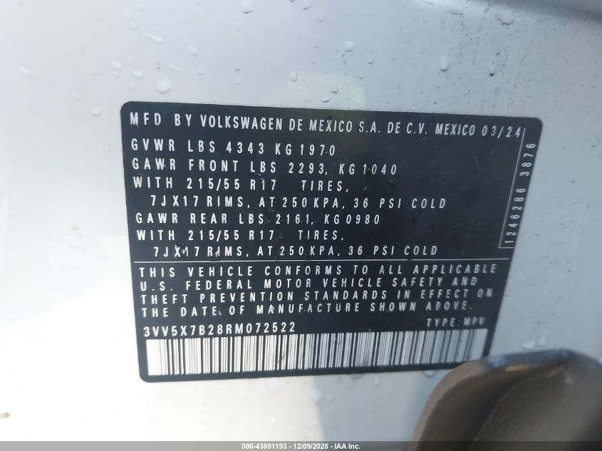 2024 VOLKSWAGEN TAOS - 3VV5X7B28RM072522, цвет - Белый, 1.5, Бензин, Передний привод из США