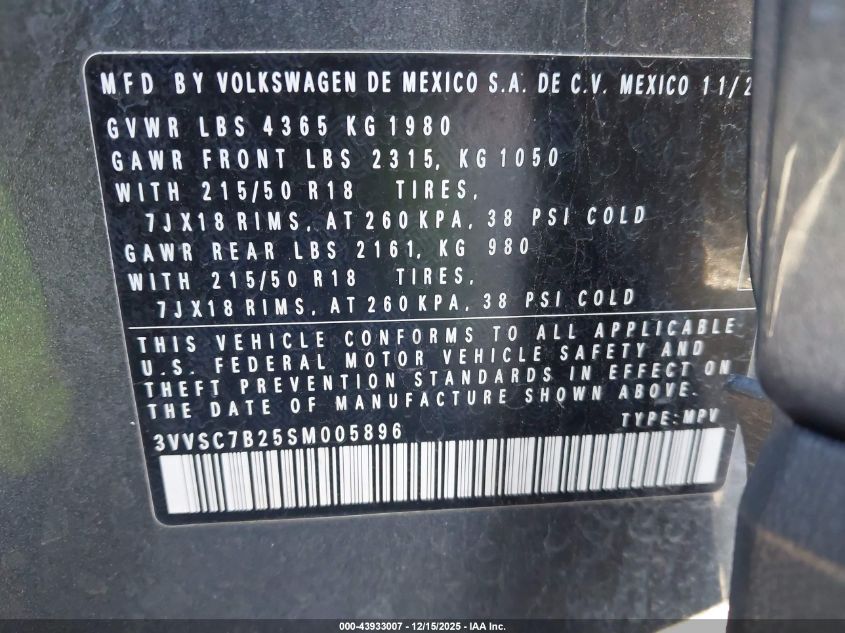 2025 VOLKSWAGEN TAOS - 3VVSC7B25SM005896, цвет - , 1.5, Бензин, Передний привод из США