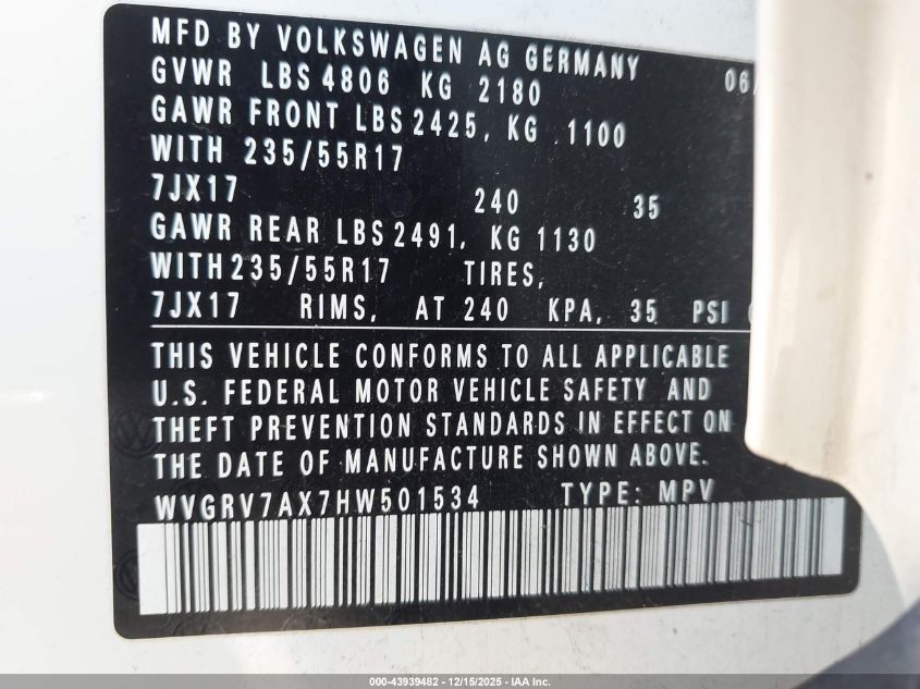 2017 VOLKSWAGEN TIGUAN - WVGRV7AX7HW501534, цвет - Белый, 2.0, Бензин, Передний привод из США