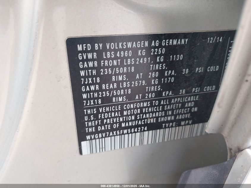 2015 VOLKSWAGEN TIGUAN - WVGBV7AX5FW564274, цвет - Серебряный, 2.0, Бензин, Полный привод из США