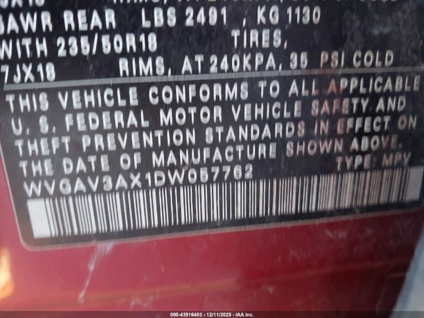 2013 VOLKSWAGEN TIGUAN - WVGAV3AX1DW057762, цвет - Красный, 2.0, Бензин, Передний привод из США