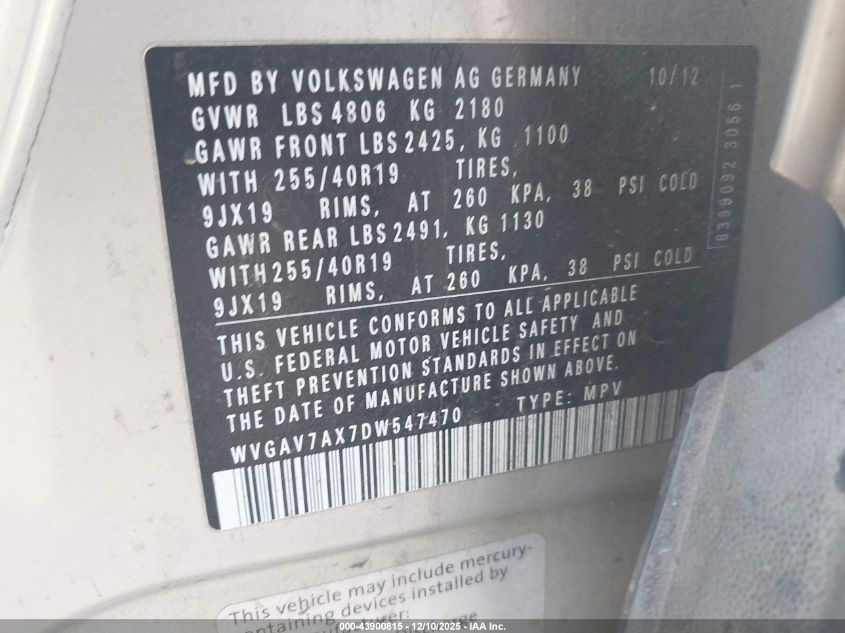 Цвет СеребряныйЦилиндры 4Привод Передний приводVIN WVGAV7AX7DW547470Состояние Заводится и едет (проверено)Повреждения Обычный износДата аукциона 2025-12-17