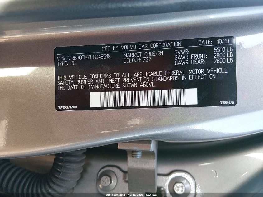 2020 VOLVO S60 - 7JRBR0FM7LG048519, цвет - Серый, 2.0, Гибрид, Полный привод из США