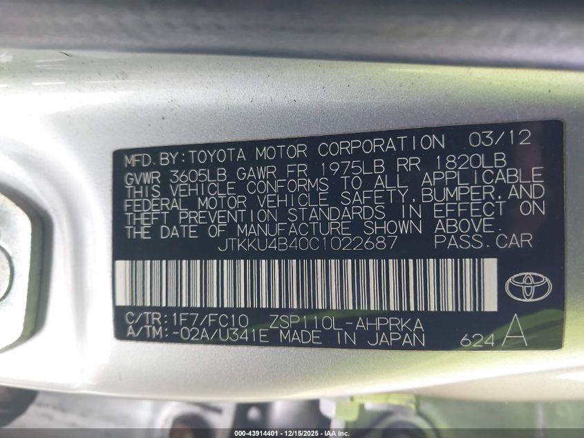 Колір СрібнийЦиліндри 4Привід Передній привідVIN JTKKU4B40C1022687Стан НевідомоУшкодження Передня або задня