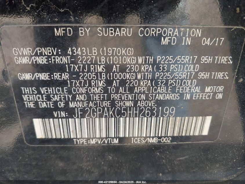 2017 SUBARU CROSSTREK - JF2GPAKC5HH263199, колір - Чорний, 2.0, Бензин, Повний привід із США