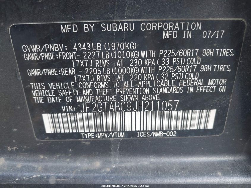 Колір ЧорнийЦиліндри 4Привід Повний привідVIN JF2GTABC9JH211057Стан Заводиться та їде (перевірено)Ушкодження Права сторона