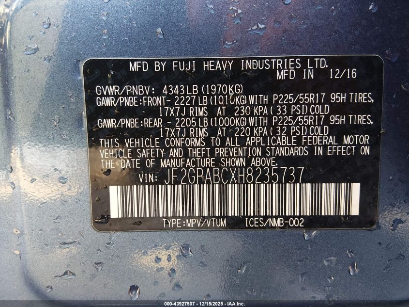 2017 SUBARU CROSSTREK - JF2GPABCXH8235737, колір - Синій, 2.0, Бензин, Повний привід із США