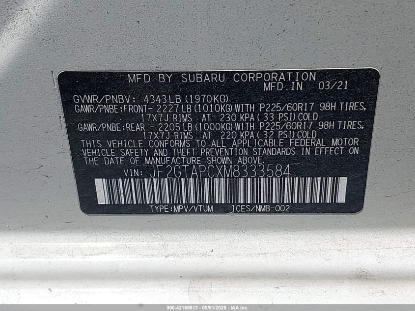 2021 SUBARU CROSSTREK - JF2GTAPCXM8333584, колір - Білий, 2.0, Бензин, Повний привід із США