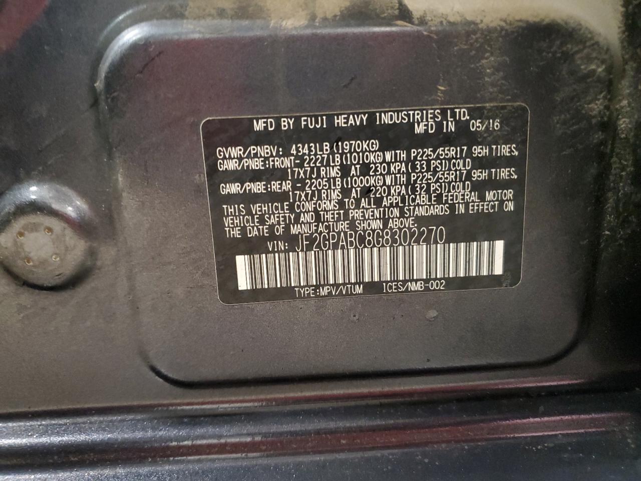Колір ЧорнийЦиліндри 4Привід Повний привідVIN JF2GPABC8G8302270Стан Заводиться та їде (перевірено)Ушкодження Передня або задняДата аукціона 2025-10-08