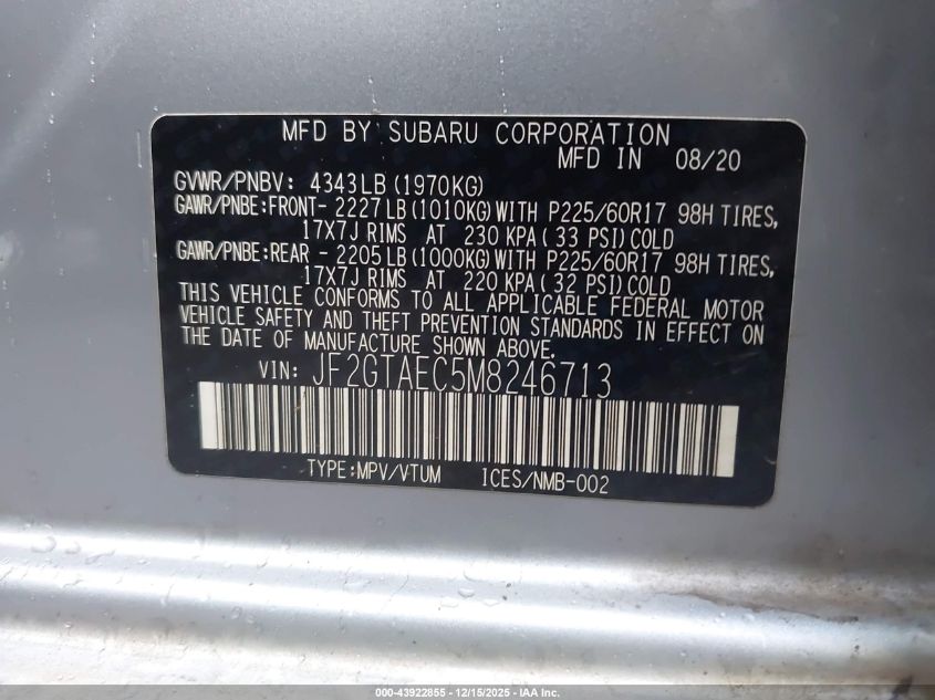 2021 SUBARU CROSSTREK - JF2GTAEC5M8246713, колір - Срібний, 2.0, Бензин, Повний привід із США