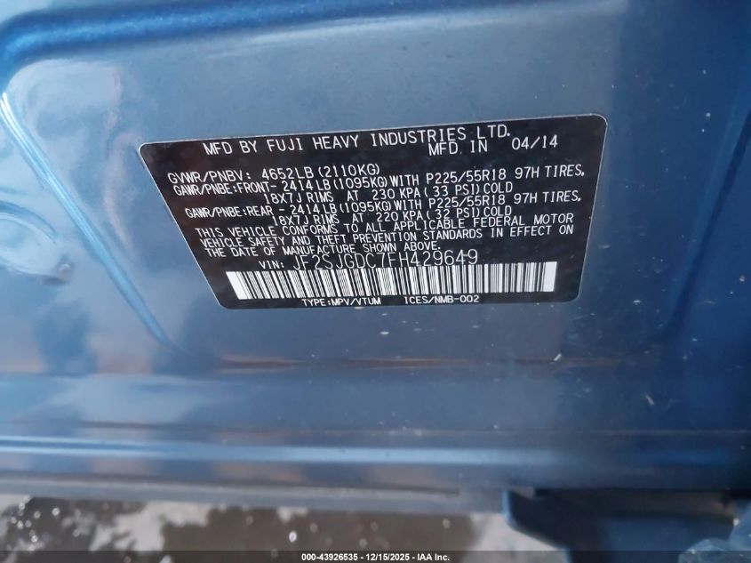 Колір СинійЦиліндри 4Привід Повний привідVIN JF2SJGDC7FH429649Стан СтаціонарноУшкодження Передня або задня