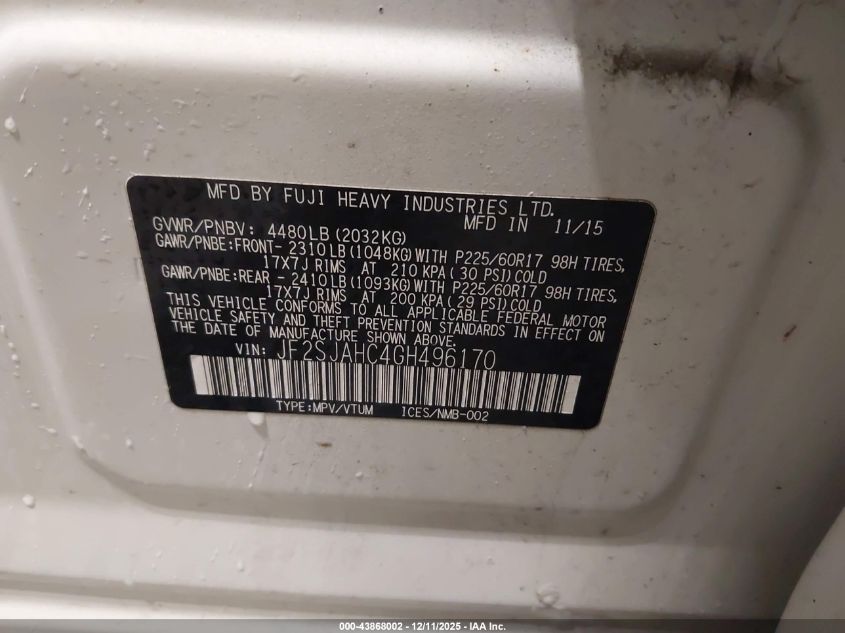 Колір БілийЦиліндри 4Привід Повний привідVIN JF2SJAHC4GH496170Стан Заводиться та їде (перевірено)Ушкодження Права сторона