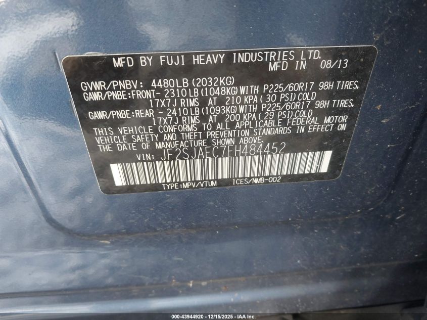 Колір СинійЦиліндри 4Привід Повний привідVIN JF2SJAEC7EH484452Стан НевідомоУшкодження Звичайний знос
