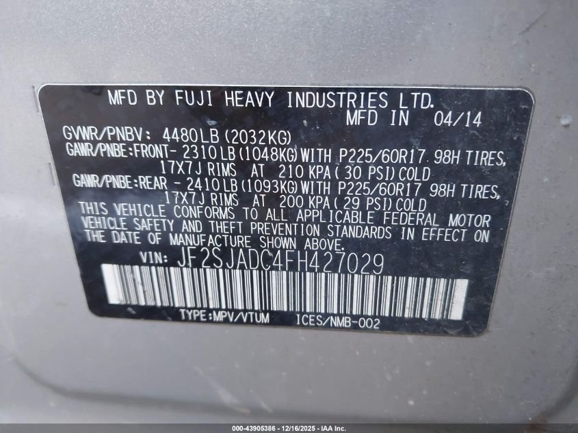 Колір СрібнийЦиліндри 4Привід Повний привідVIN JF2SJADC4FH427029Стан НевідомоУшкодження Звичайний знос