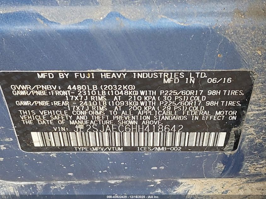 Колір СинійЦиліндри 4Привід Повний привідVIN JF2SJAEC6HH418642Стан Заводиться та їде (перевірено)Ушкодження Передня або задня