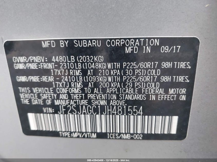 Колір СрібнийЦиліндри 4Привід Повний привідVIN JF2SJAGC1JH481554Стан Заводиться та їде (перевірено)Ушкодження Права сторона