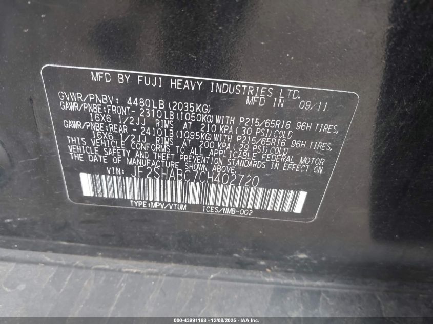 Колір ЧорнийЦиліндри 4Привід Повний привідVIN JF2SHABC7CH402720Стан Заводиться та їде (перевірено)Ушкодження Звичайний зносДата аукціона 2025-12-19