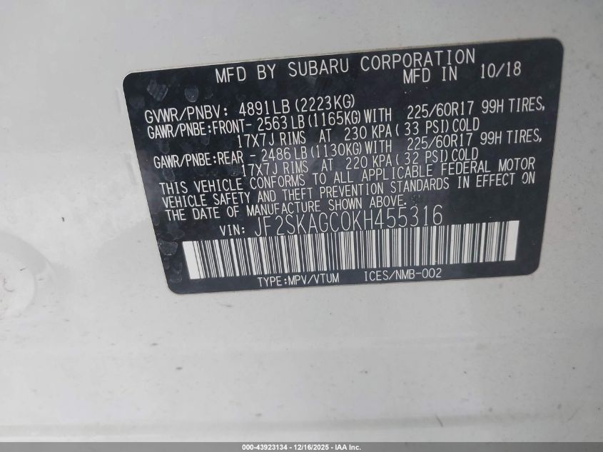 2019 SUBARU FORESTER - JF2SKAGC0KH455316, колір - Білий, 2.5, Бензин, Повний привід із США