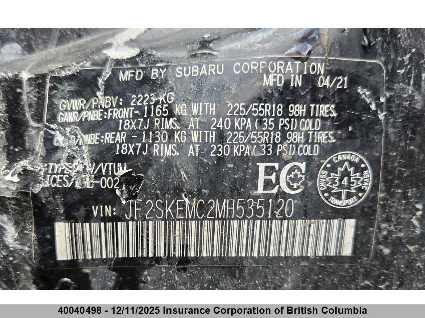 Колір ЧорнийЦиліндри 4Привід Повний привідVIN JF2SKEMC2MH535120Стан СтаціонарноУшкодження Передня ліваДата аукціона 2025-12-15