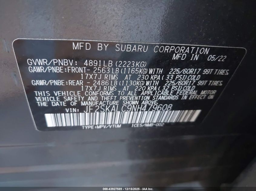 Колір СірийЦиліндри 4Привід Повний привідVIN JF2SKALC9NH479608Стан СтаціонарноУшкодження Передня або задня