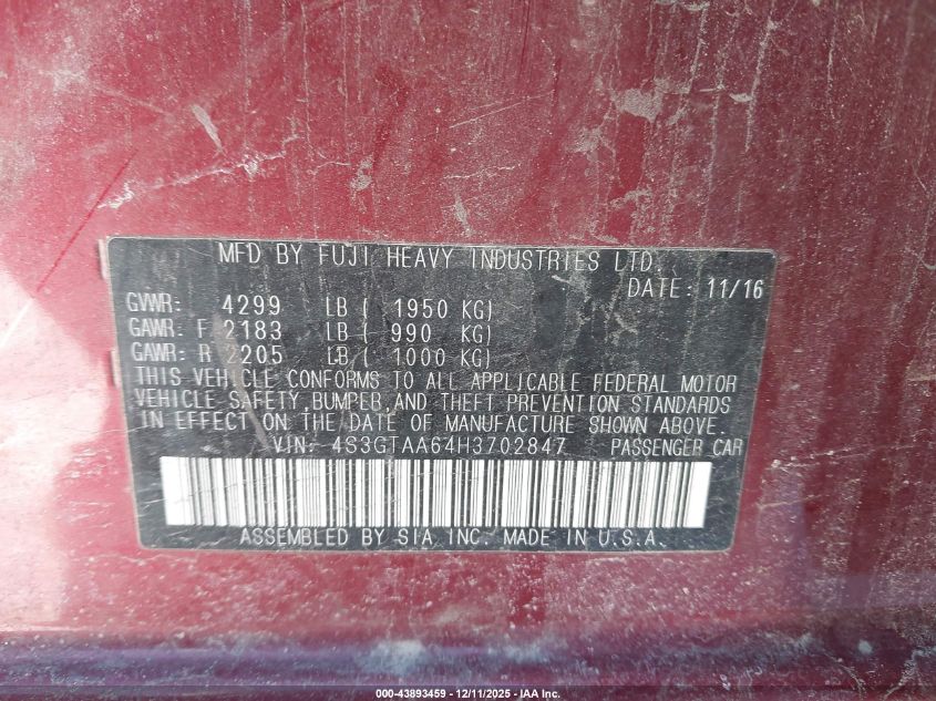 2017 SUBARU IMPREZA - 4S3GTAA64H3702847, колір - Червоний, 2.0, Бензин, Повний привід із США