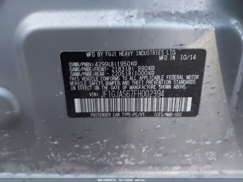 2015 SUBARU IMPREZA - JF1GJAS67FH002394, колір - Сірий, 2.0, Бензин, Повний привід із США