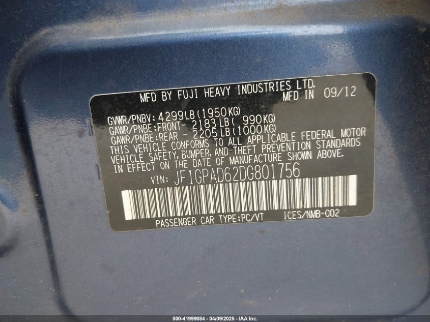 2013 SUBARU IMPREZA - JF1GPAD62DG801756, колір - Синій, 2.0, Бензин, Повний привід із США