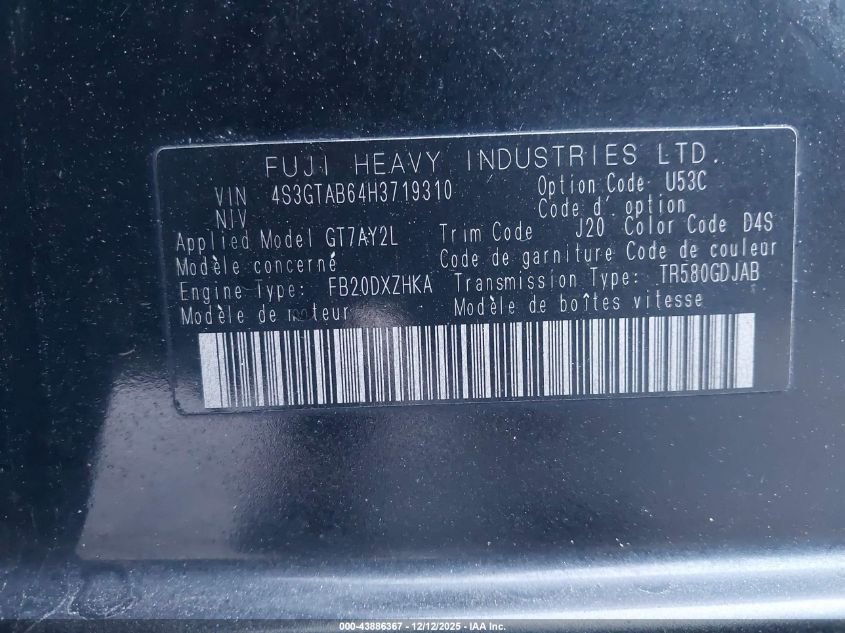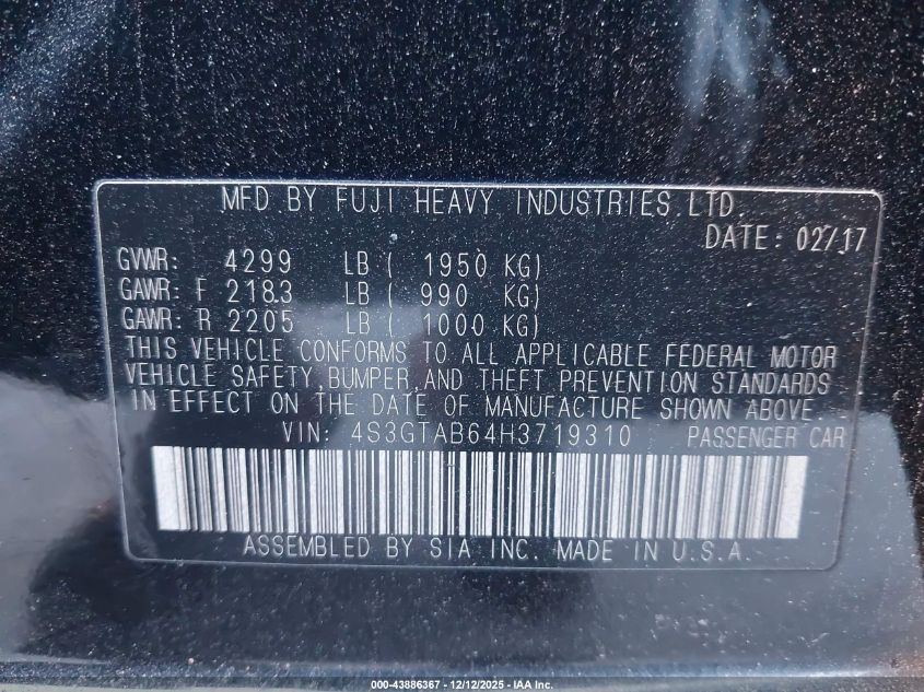 2017 SUBARU IMPREZA - 4S3GTAB64H3719310, колір - Чорний, 2.0, Бензин, Повний привід із США