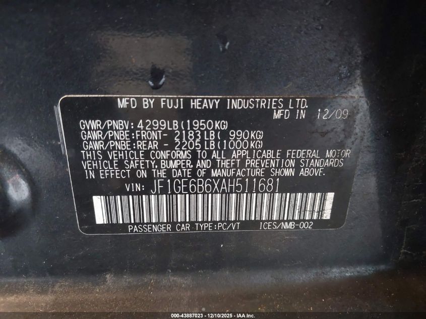 Колір СірийЦиліндри 4Привід Повний привідVIN JF1GE6B6XAH511681Стан СтаціонарноУшкодження Передня або задня